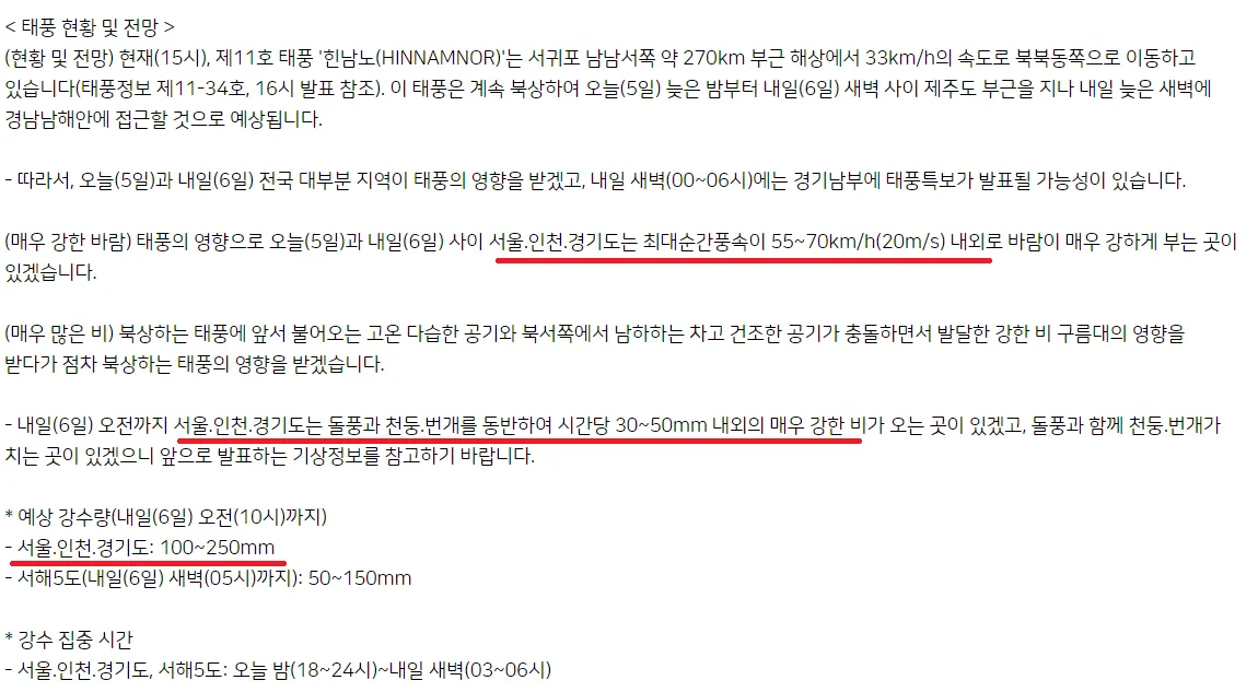 2022-09-05 (월)부터 북상하는 태풍 11호 '힌남노'의 영향으로 전국 100~250mm의 비가 쏟아질 예정이며,